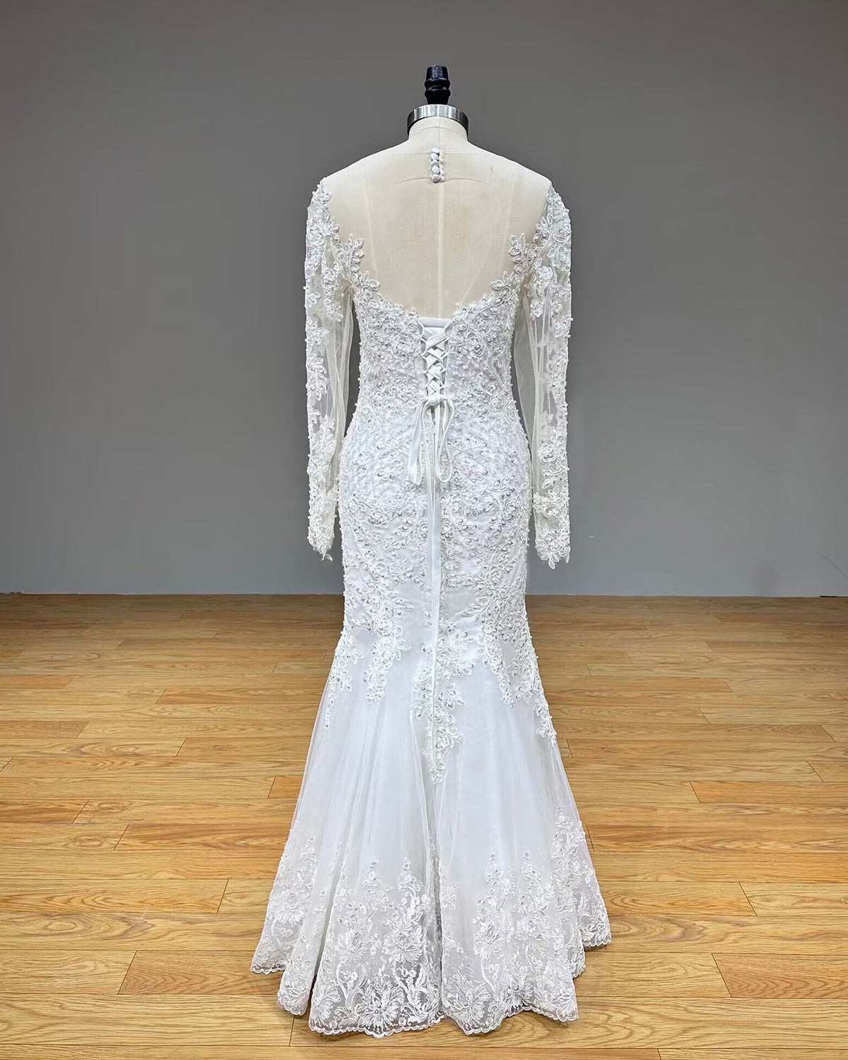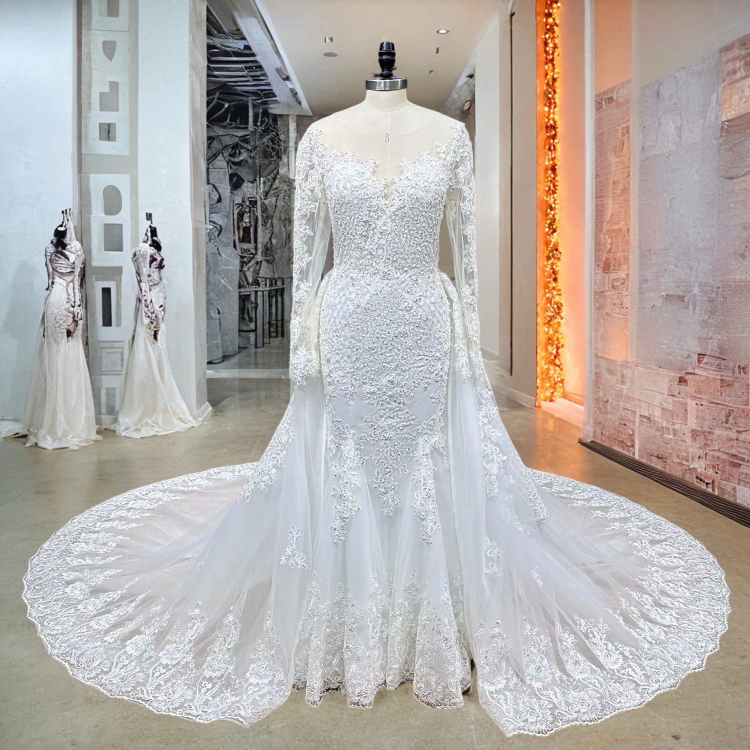Long Sleeve Mermaid Wedding Dress with Detachable Train Vintage Luxury Bridal Gown