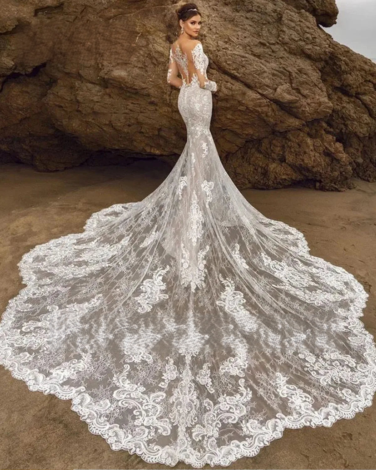 Long Sleeve Mermaid Wedding Dress with Pearl Back Beading and Lace Appliques