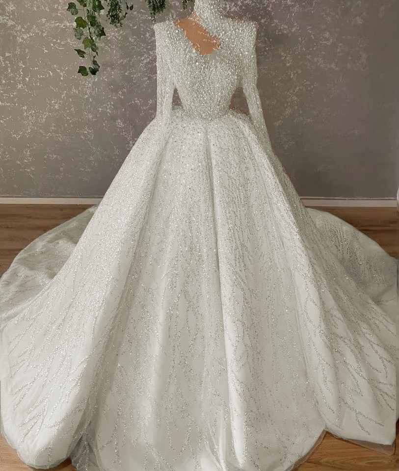 Step into elegance with this high-neck bridal gown, featuring shimmering sequins, a sheer illusion bodice, and timeless long sleeves. Designed to flatter every curve, it blends classic beauty with modern allure for an unforgettable aisle moment.