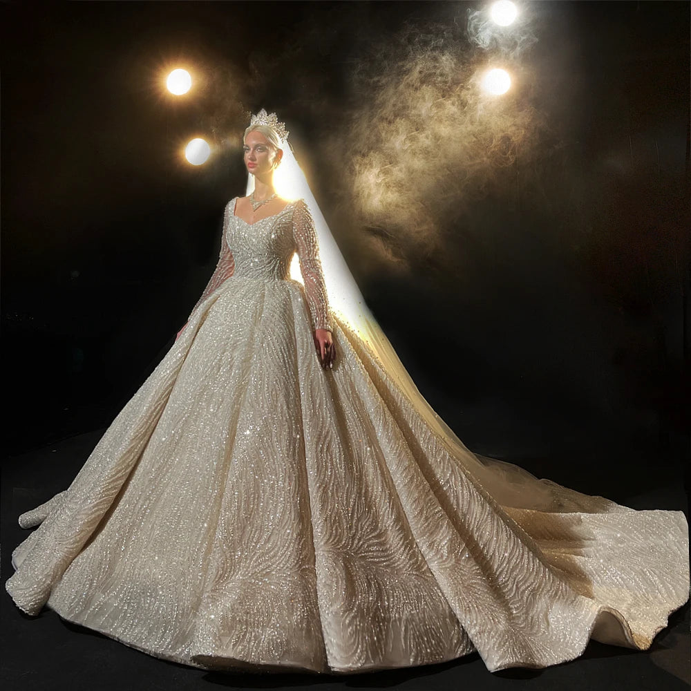 Luxury Square Collar Long Sleeve Wedding Dress Elegant Bridal Gown