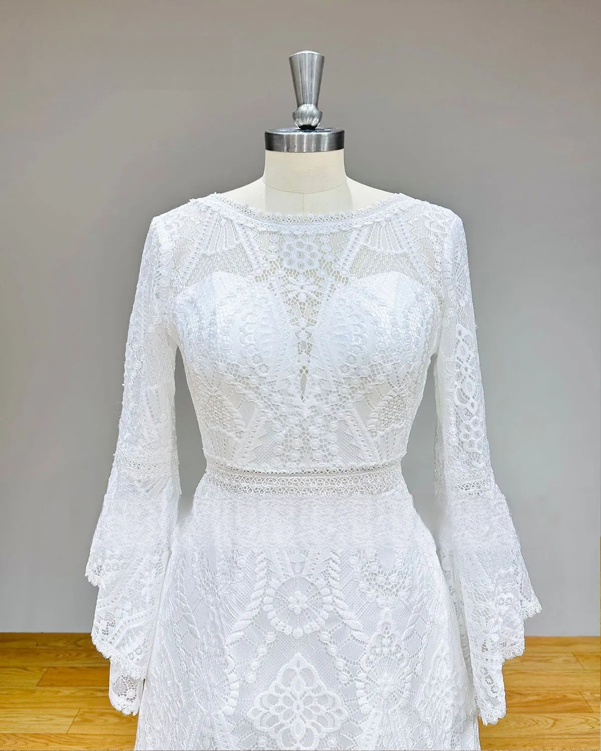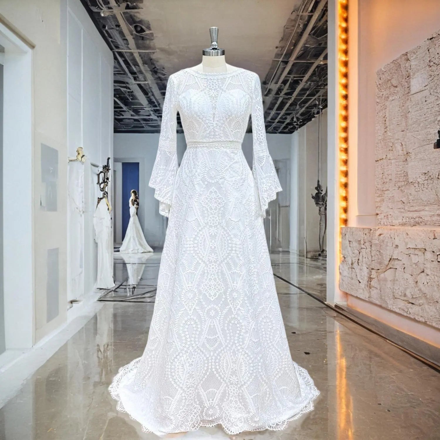 This O-neck backless lace wedding dress blends timeless elegance with modern allure, featuring intricate lacework, a flattering see-through waist, and graceful long sleeves for a chic silhouette. Designed with high-quality fabric for comfort and movement, it's perfect for brides seeking a sophisticated yet contemporary look on their special day.