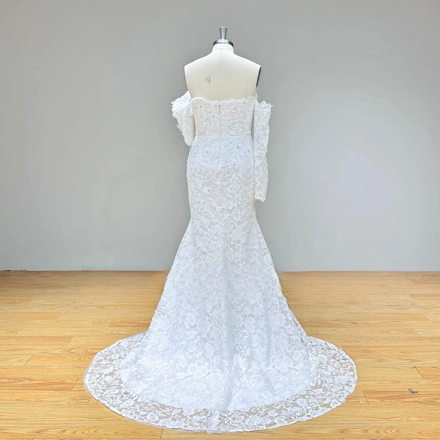 Turn heads in this Off Shoulder 2-Piece Mermaid Wedding Dress with intricate beading and a detachable train. A chic, curve-hugging silhouette made for the modern bride who loves elegance and glamour.