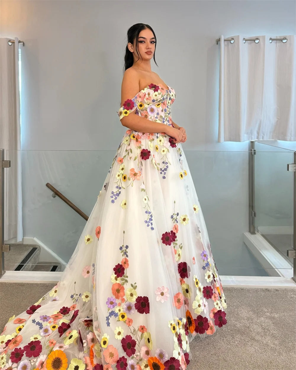 Step into your fairytale moment with this Off-Shoulder 3D Floral A-Line Wedding Dress. Featuring an elegant neckline, flattering bodice, and cascading 3D floral appliqués, it exudes romance and timeless charm. The flowing court train and lightweight fabric ensure graceful movement, making it perfect for garden, ballroom, or destination weddings. A dreamy choice for the modern bride with classic elegance.