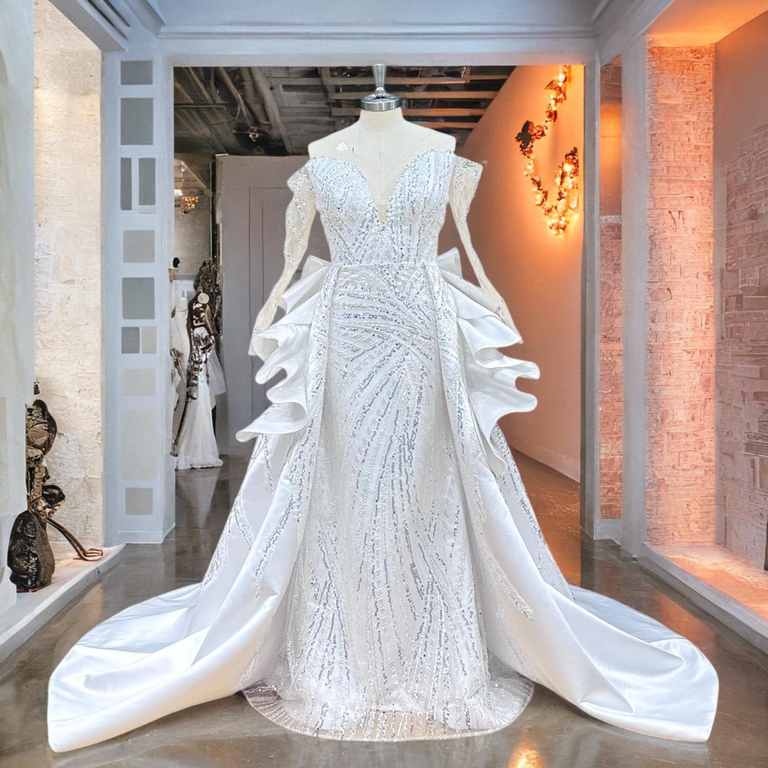 Turn heads in this off-shoulder mermaid wedding dress with long sleeves and dazzling beadwork. Featuring a detachable train, it’s the perfect blend of elegance and modern flair.