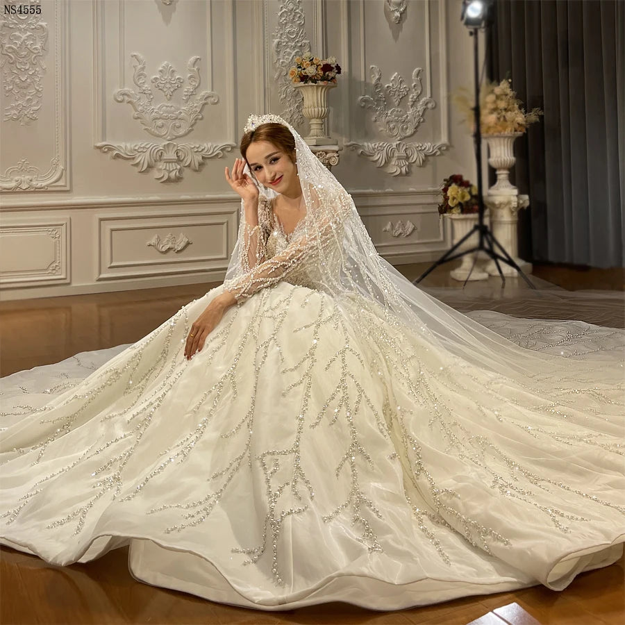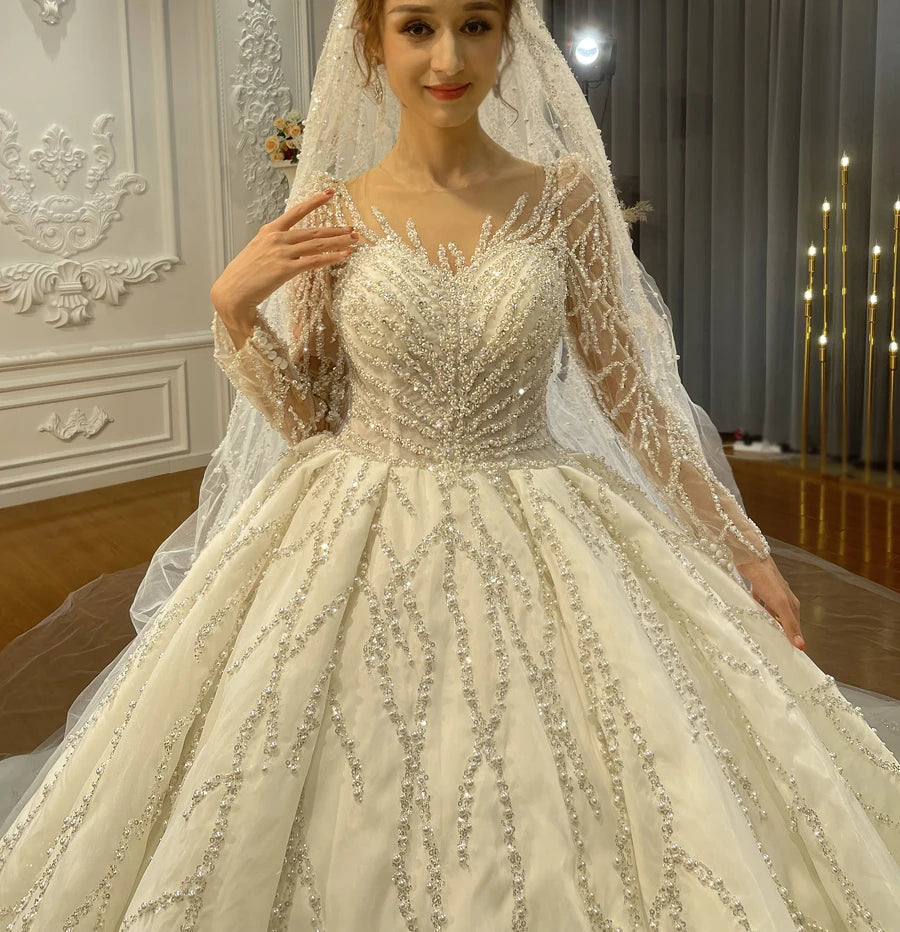 Off-White Luxury Ball Gown Wedding Dress with Long Sleeves Elegant Bridal Gown