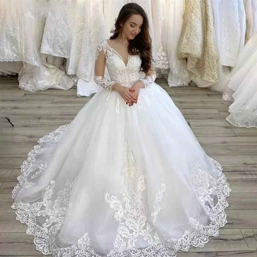 Plus Size V Neck Long Sleeves Court Train Wedding Dress Court Train Bridal Gown