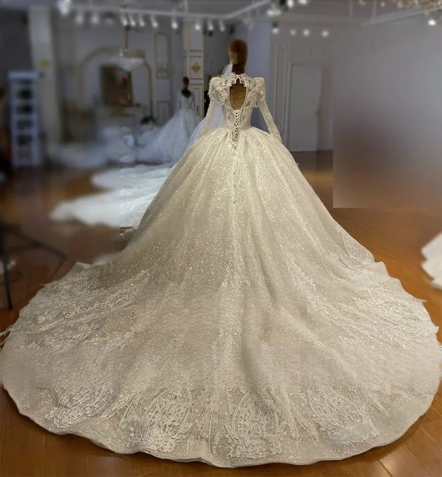 This Customized Royal V-Neck Princess Luxury Wedding Gown combines timeless elegance and modern sophistication with its regal V-neckline, long sleeves, intricate beadwork, and exquisite lace accents. Crafted for a flawless fit and exceptional comfort, it ensures every bride feels like a true princess on her unforgettable wedding day.