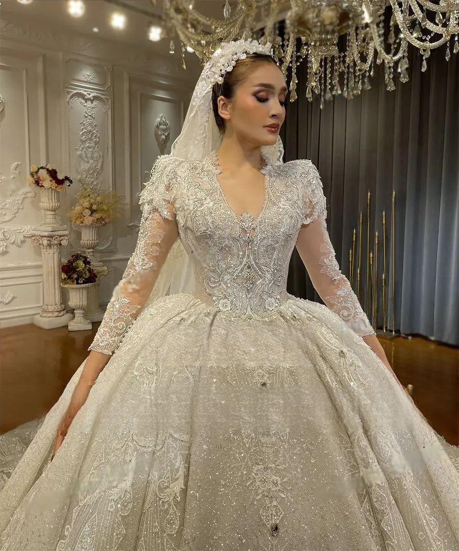 Royal V-Neck Princess Luxury Wedding Gown Long Sleeve