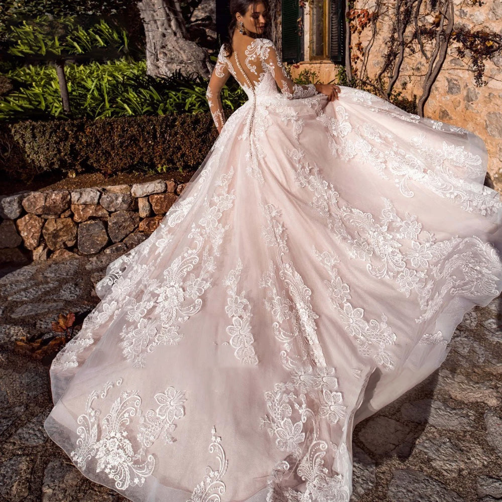 Indulge in timeless romance with Elsi John's Sexy Illusion Long Sleeve A-Line Vintage Wedding Dress, featuring a scoop neck, delicate appliques, and a graceful court train. Embrace elegance and allure as you say 'I do' in unforgettable style.