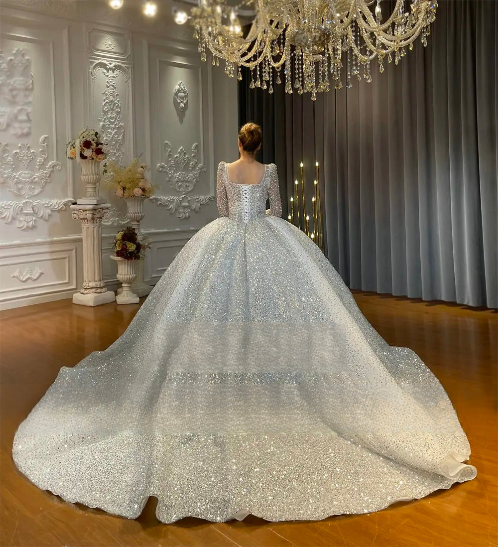 Square Neckline Long Sleeve Sparkly Ball Gown Wedding Dress Elegant Bridal Gown