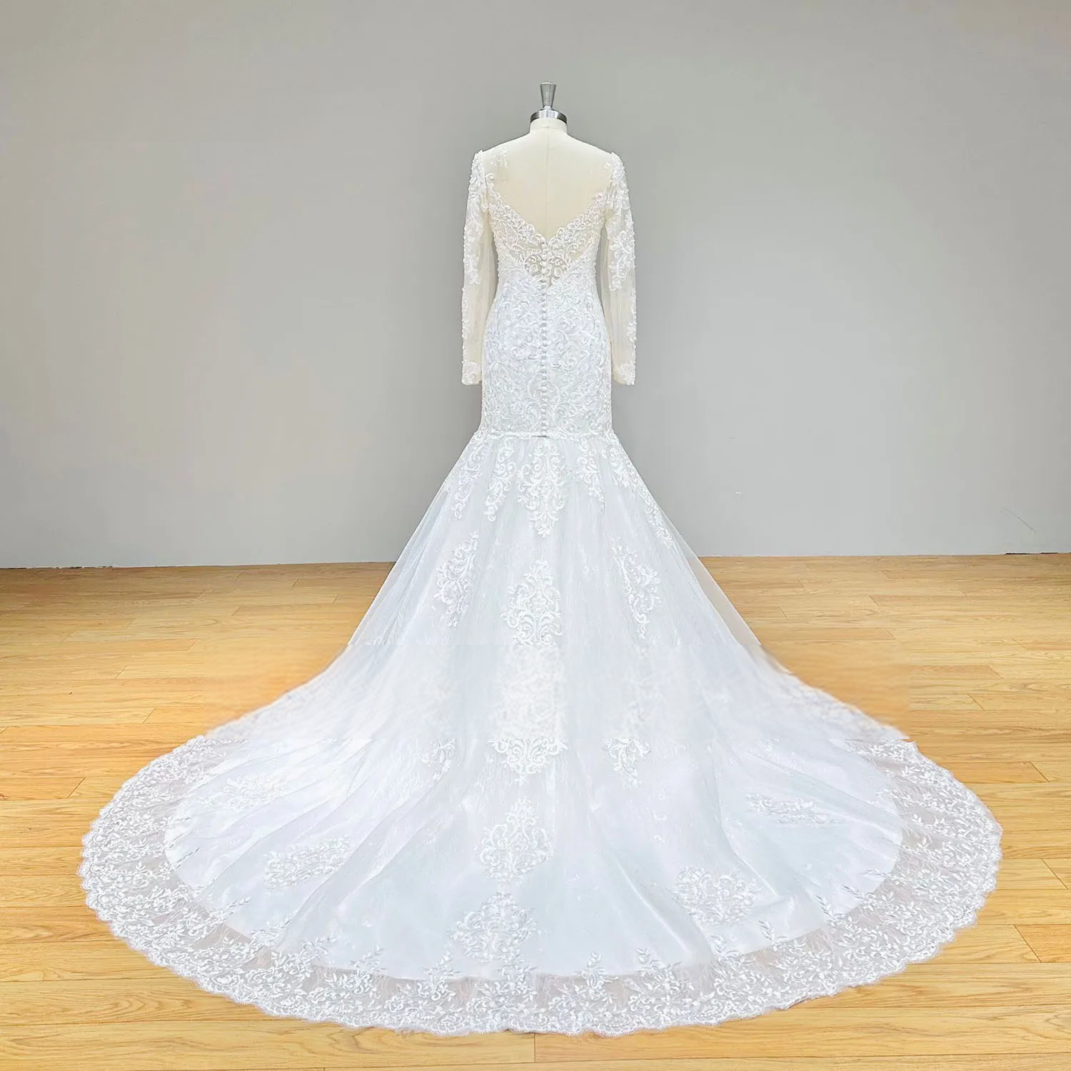 Make a stunning entrance in this Sweetheart Backless Mermaid Wedding Dress, adorned with lace, pearls, and a dramatic open back. Featuring a detachable skirt and flowing tulle, it offers two elegant looks for the modern romantic bride.