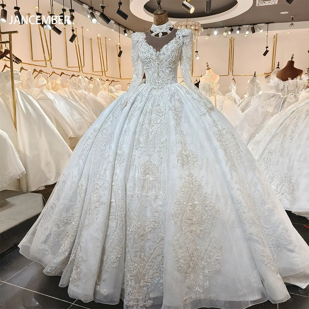 Vintage Glitter Long Sleeve Pleated Ball Gown Backless Wedding Dress