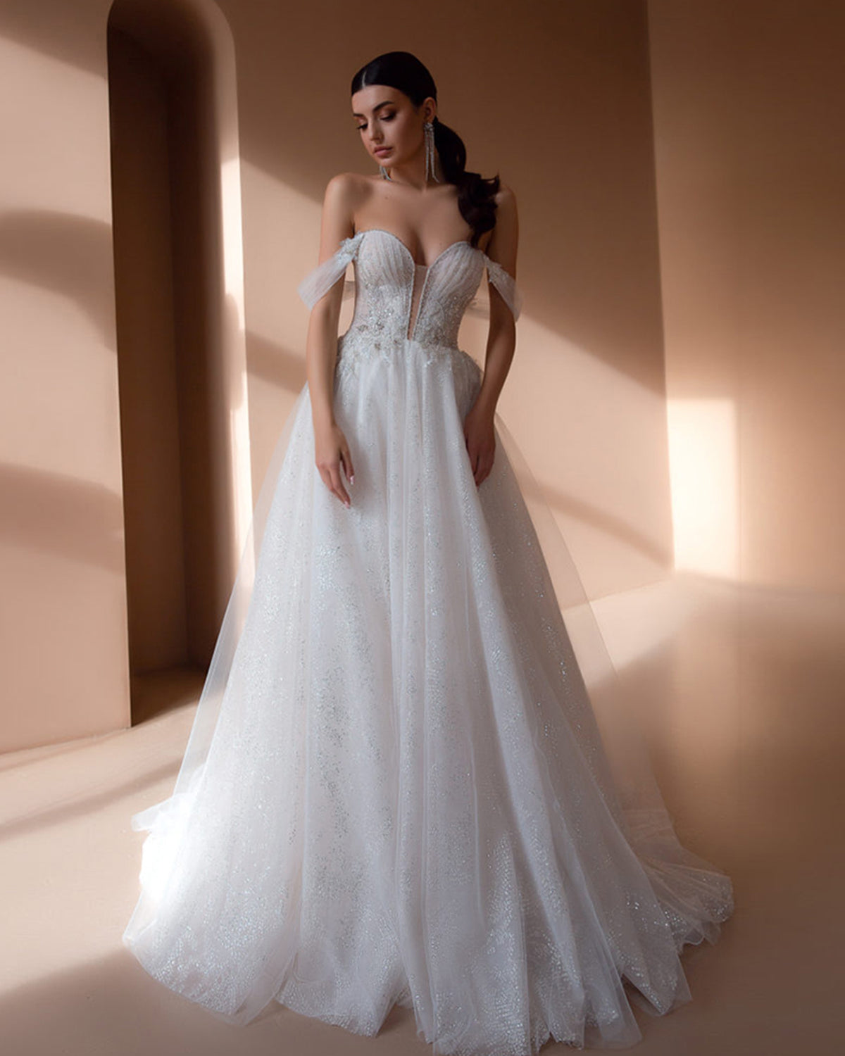 Make a timeless statement in our Elegant A-Line Off-Shoulder Wedding Dress, adorned with intricate beading and delicate appliques for a romantic, refined look. Designed to flatter and flow with grace, it’s the perfect blend of comfort, elegance, and modern bridal charm.