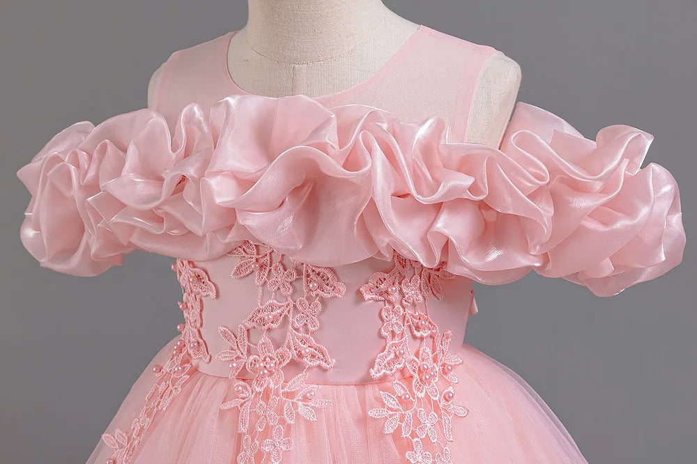 Girl's Off-Shoulder Pearl Princess Dress with Bubble Sleeves for Birthday & Wedding (4-12 Years)