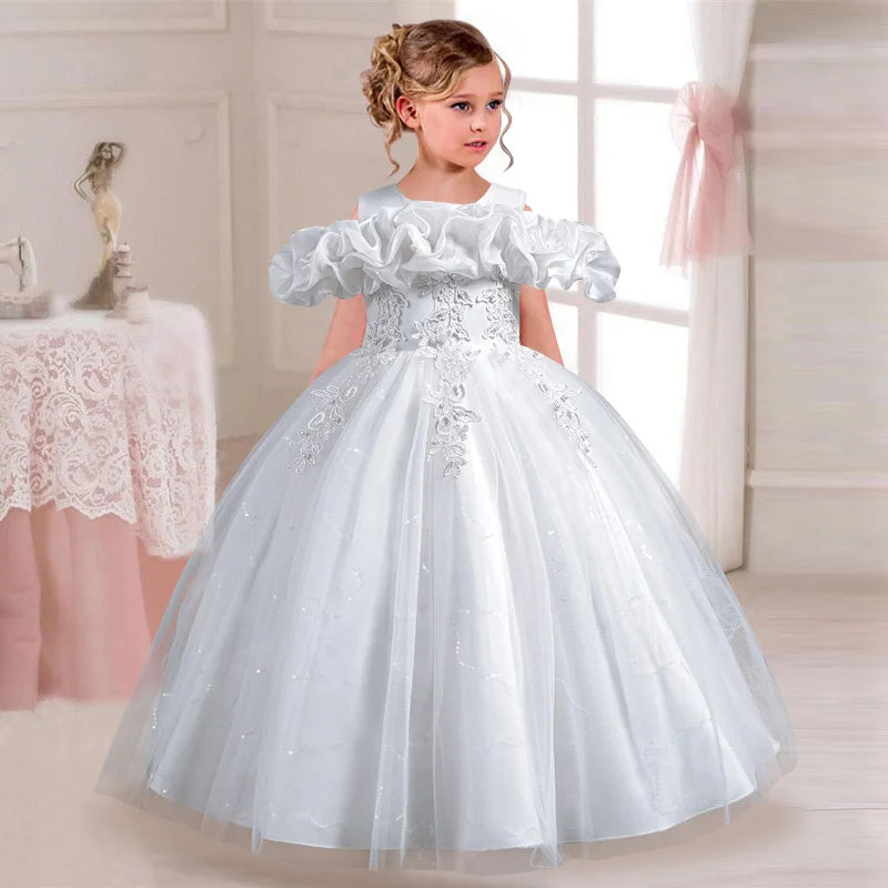Let your little one shine in this Off-Shoulder Pearl Princess Dress, designed for girls aged 4–12. With bubble sleeves, pearl embellishments, and a flowy skirt, it’s perfect for birthdays, weddings, and photo-worthy moments.