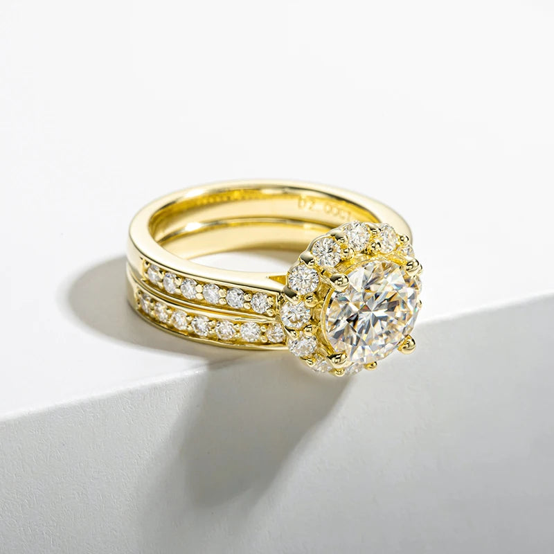 Celebrate your love with our 2 Carat D Color Moissanite Engagement Ring Set, crafted in 925 Sterling Silver with a luxurious yellow gold finish. Featuring flawless, lab-created stones, this elegant set offers timeless beauty and brilliance for any special occasion.