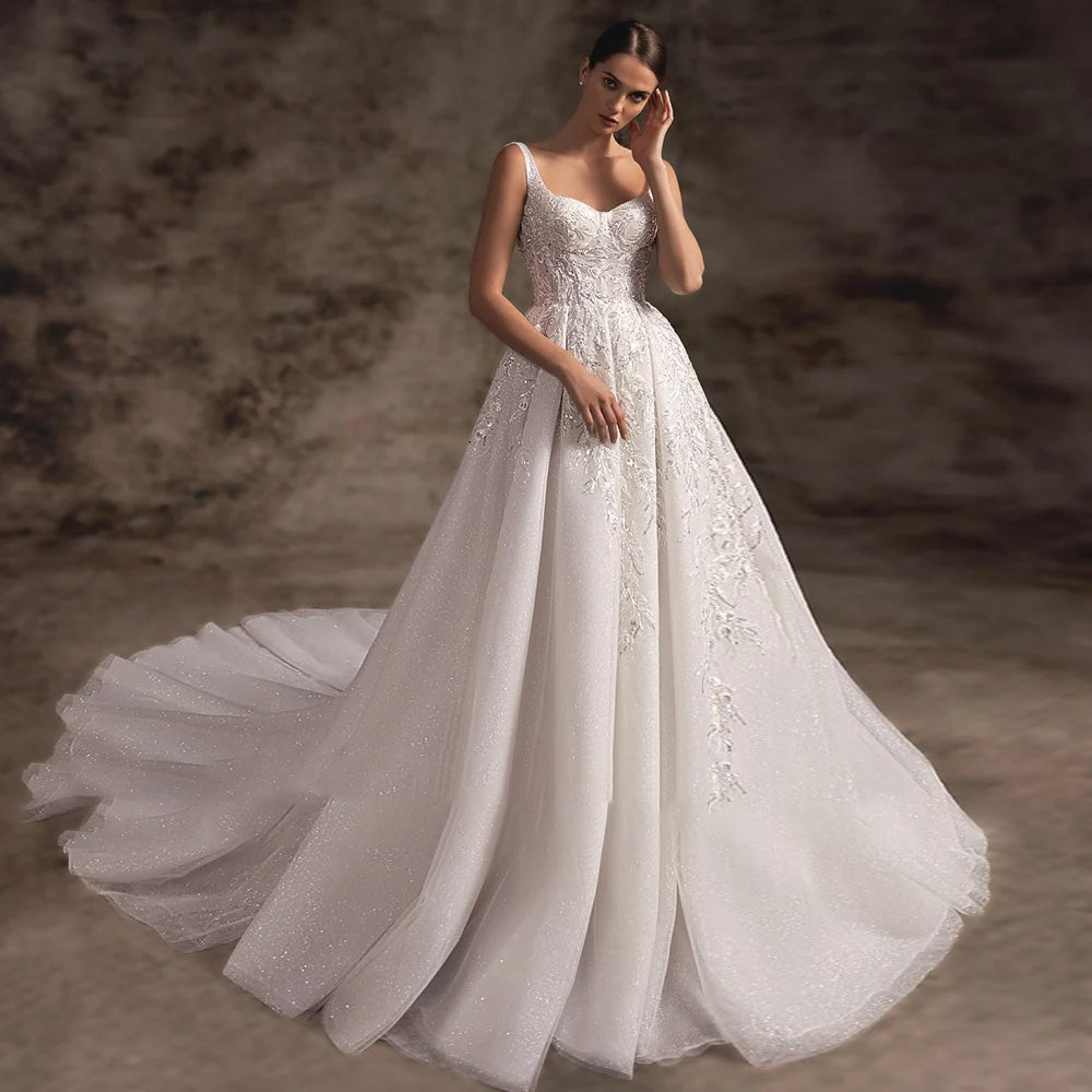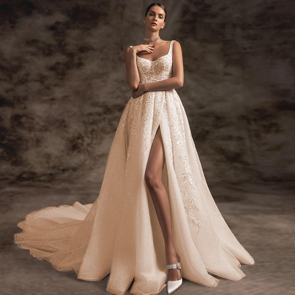 Elsi John presents a vintage-inspired Beaded A-Line Wedding Dress with spaghetti straps, sexy split, and court train. Intricate beading and a flattering silhouette create timeless elegance for your special day.