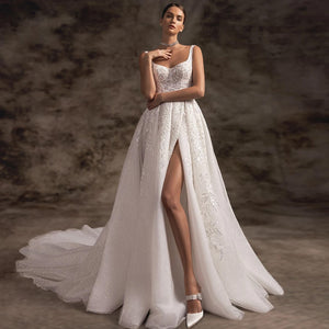 Sexy Slit A-Line Vintage Wedding Dress Luxury Spaghetti Straps Backless Court Train