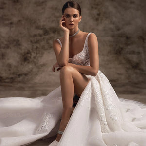 Elsi John presents a masterpiece with this Beaded A-Line Vintage Wedding Dress with sexy split. Elevate your bridal style with its luxurious spaghetti straps, backless design, and court train. The intricately beaded details add a touch of vintage charm, creating a timeless and elegant look. The A-line silhouette ensures a flattering fit for every figure. Walk down the aisle in grace and sophistication, making a statement on your special day with this Elsi John creation. Capture the essence of timeless beauty and celebrate your love story in style.