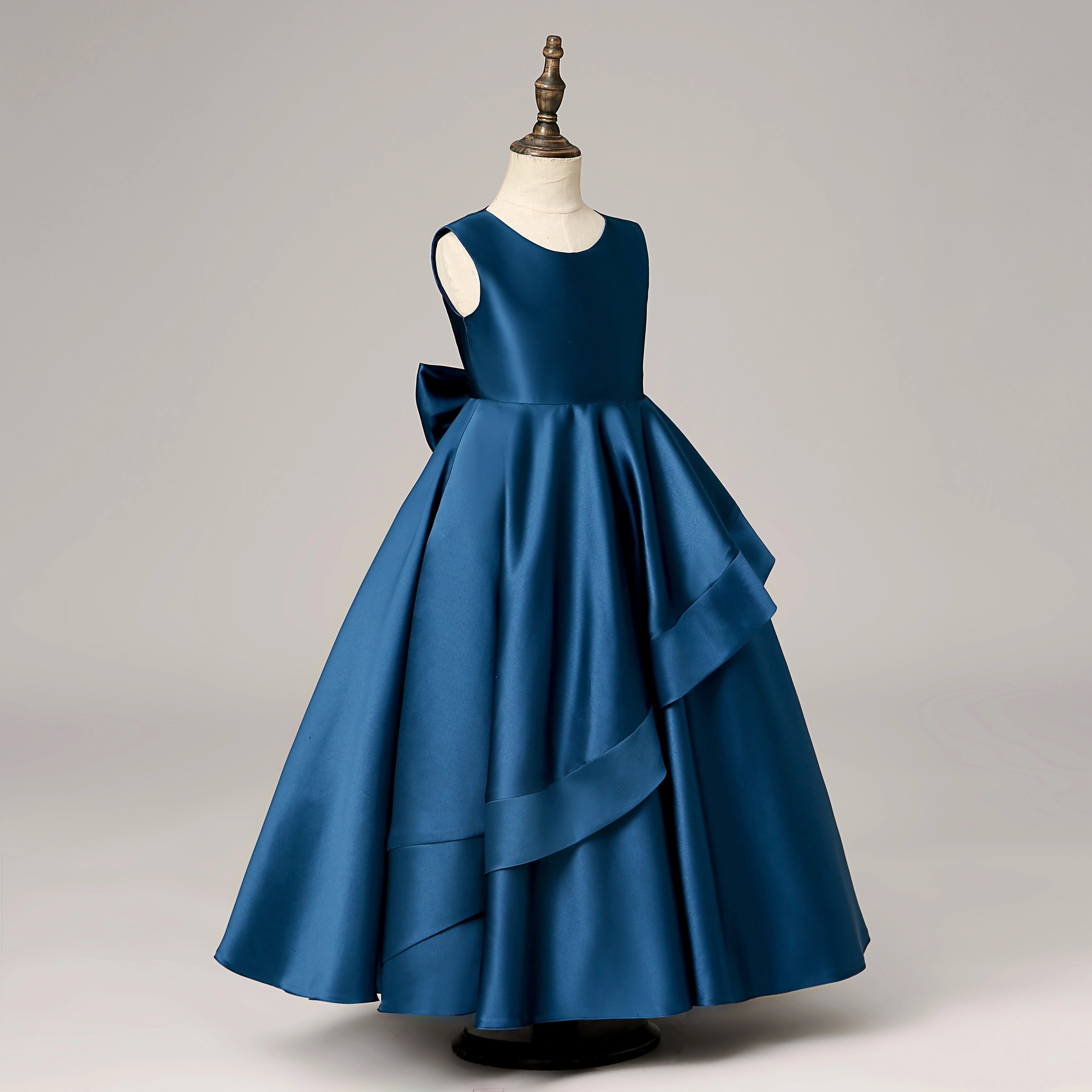 An exquisite satin flower girl dress in soft blue and pink, featuring floral embellishments and a classic silhouette for timeless elegance. Perfect for weddings and pageants, it offers comfort, charm, and a graceful look for any special occasion.