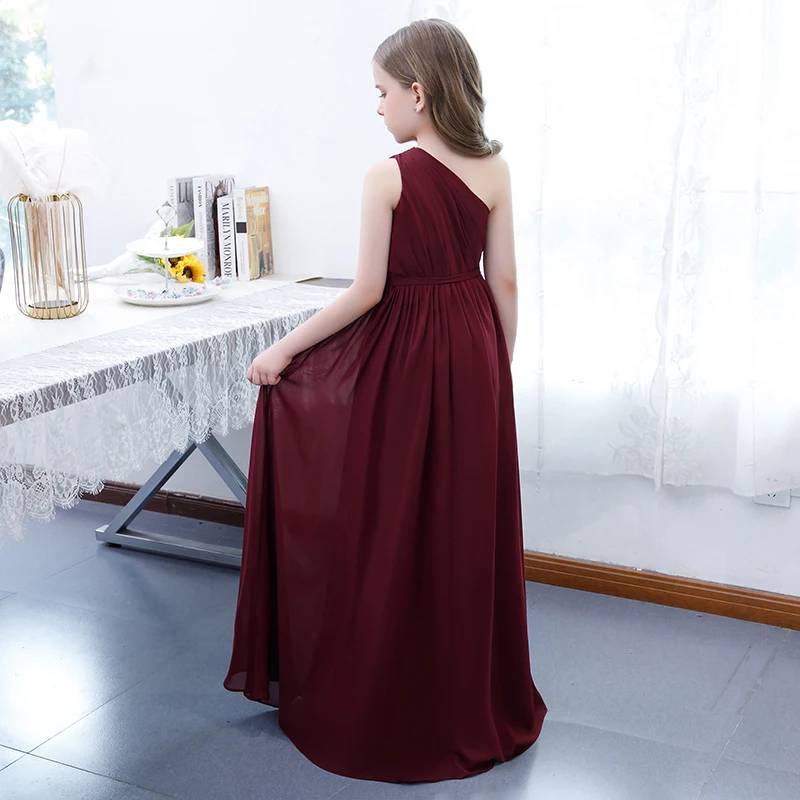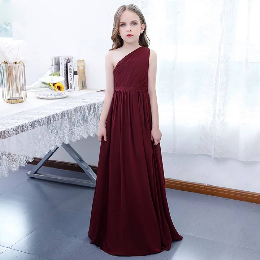 Burgundy One-Shoulder Chiffon Flower Girl Dress Junior Bridesmaid Gown