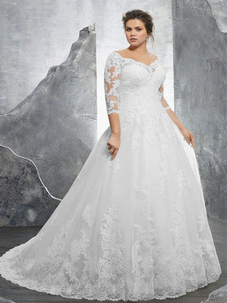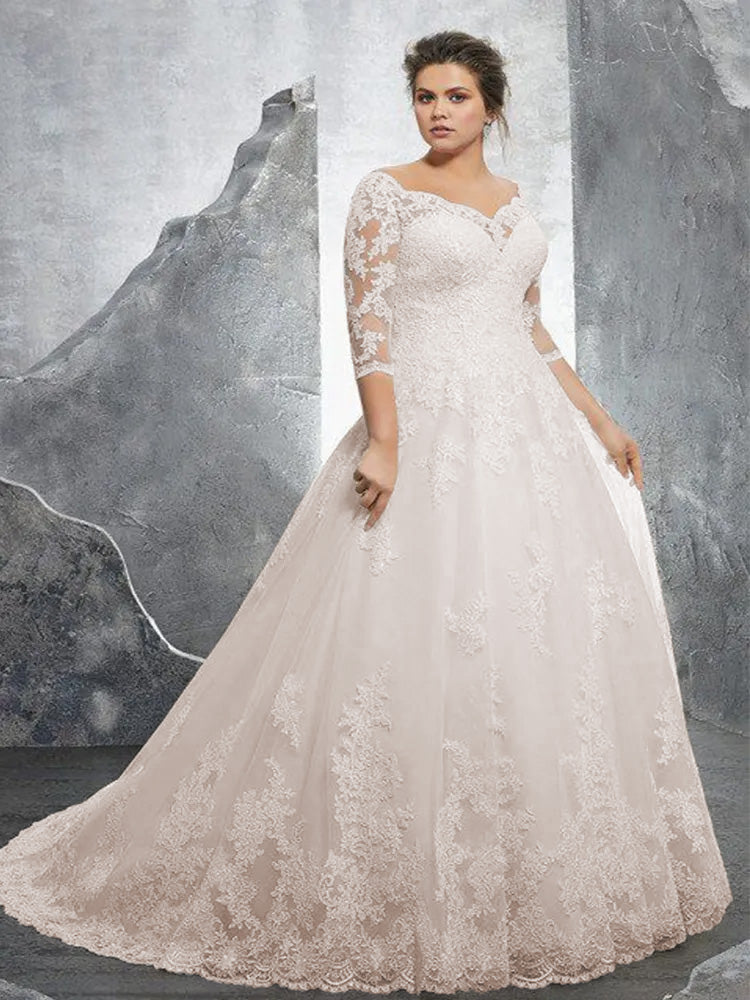 A-Line Lace Elegance 2023: Off-Shoulder Plus-Size Bridal Bliss.