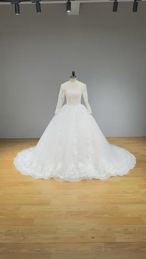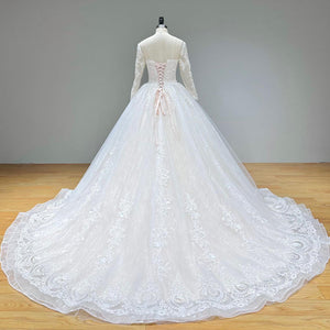 This Gorgeous Long Sleeve Satin Ball Gown Wedding Dress blends vintage sequined beading with a modern backless design for timeless elegance. Its classic silhouette and luxurious fabric create a stunning, royal look perfect for your special day.