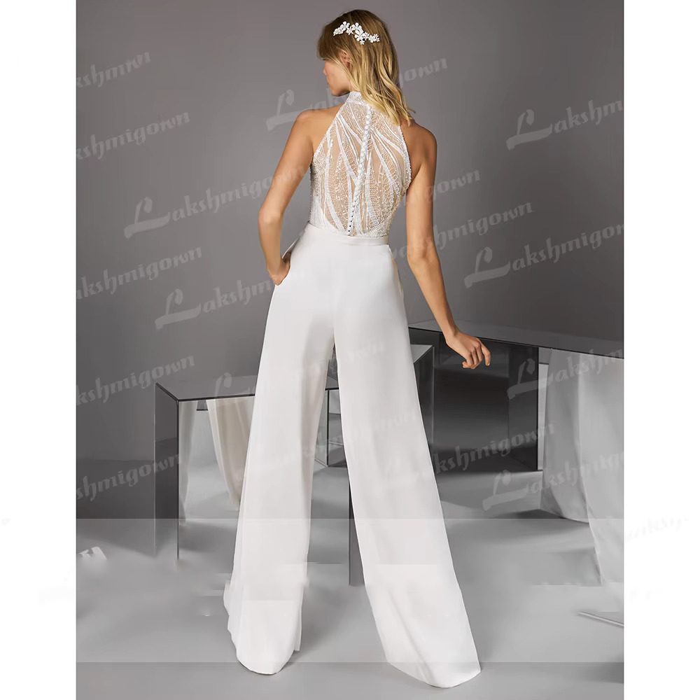 Ivory High Neck Jumpsuit Wedding Dress Pantsuit with Sequins for Brides