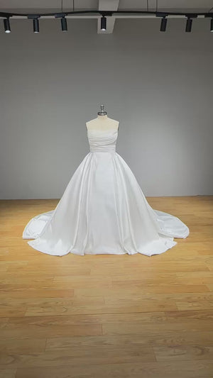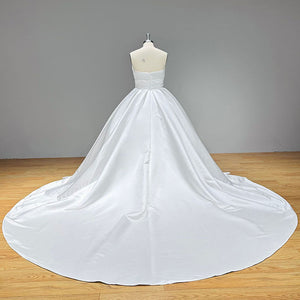This satin off-shoulder ball gown wedding dress features a pleated bodice and delicate pearl accents, combining timeless elegance with modern charm. Its luxurious fabric and voluminous silhouette create a radiant, graceful look perfect for a grand bridal entrance.