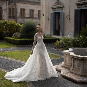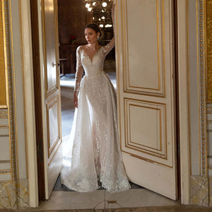 Long Sleeve Beading Sequins Appliques Mermaid Wedding Dress With Detachable Train