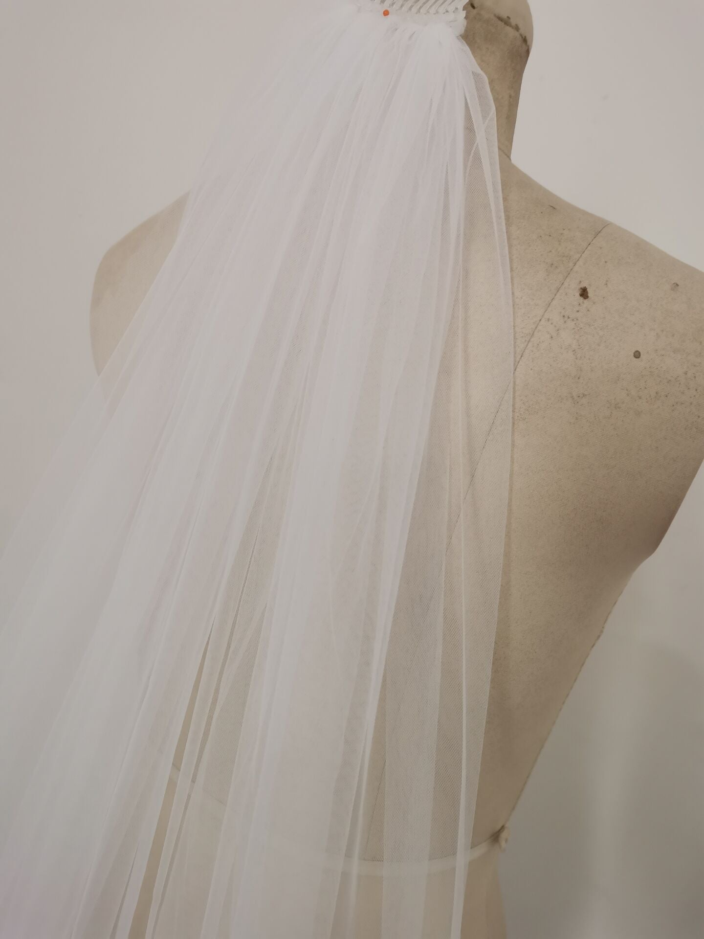 Elevate your bridal ensemble with the flowing elegance of our Long Tulle Wedding Veils. Crafted from ultra-soft, lightweight tulle, these veils drape effortlessly to create a dreamy, ethereal silhouette as you walk down the aisle. The long length adds a touch of drama and tradition, making it an ideal choice for both formal and romantic wedding settings.
