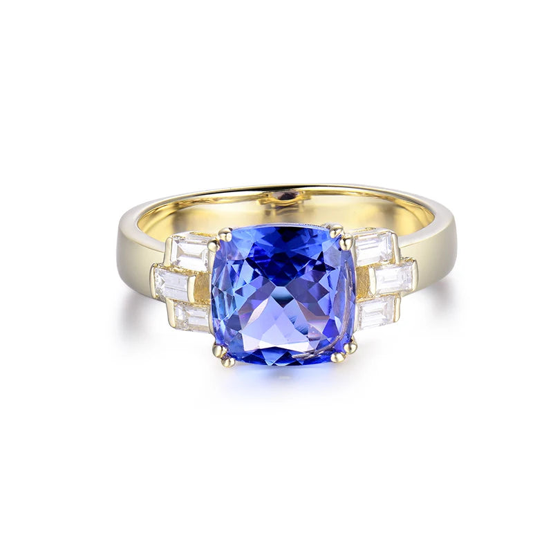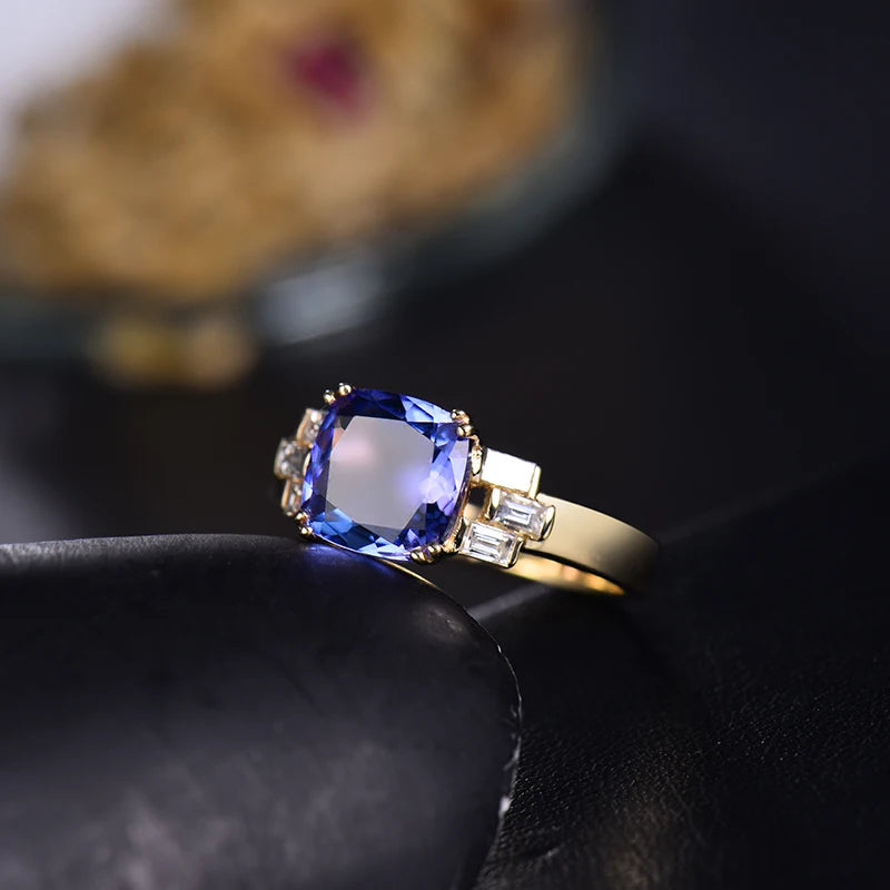 14K Yellow Gold Tanzanite & Diamond Cushion Ring – 8x8mm Engagement Jewelry for Women