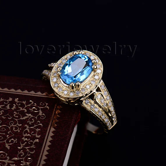 14K Yellow Gold Blue Topaz & Diamond Oval Ring – 6x8mm Engagement Jewelry