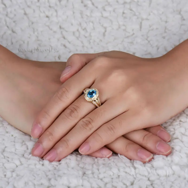 Celebrate your love with Elsi John’s 14K Yellow Gold Blue Topaz & Diamond Oval Ring. Featuring a serene 6x8mm oval blue topaz surrounded by sparkling diamonds, this timeless piece combines elegance, durability, and heartfelt meaning—perfect for engagements, anniversaries, or special gifts.