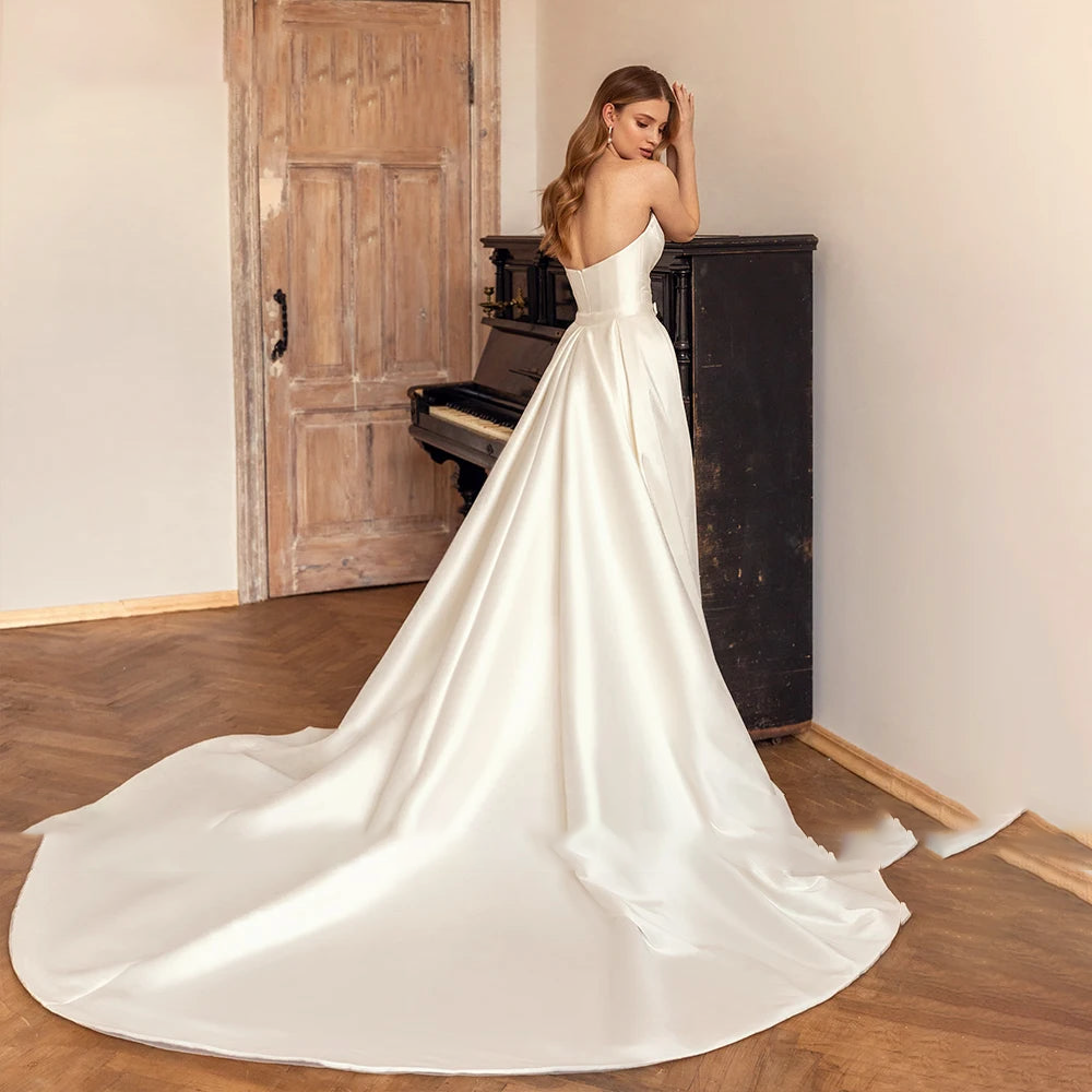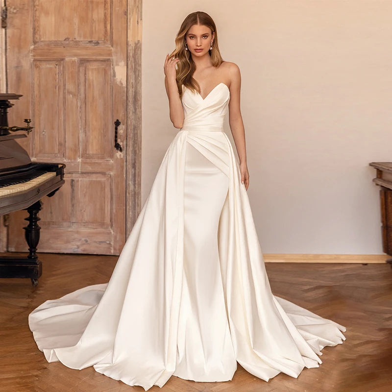 This satin mermaid wedding dress features a sweetheart neckline and detachable train for timeless elegance and modern versatility. Perfect for brides seeking a classic yet sophisticated look on their special day.