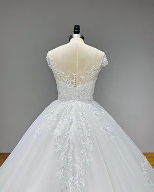 Turn heads in this off-shoulder sequined ball gown with a stunning backless design. Its voluminous skirt adds a fairytale touch for a truly unforgettable bridal look.