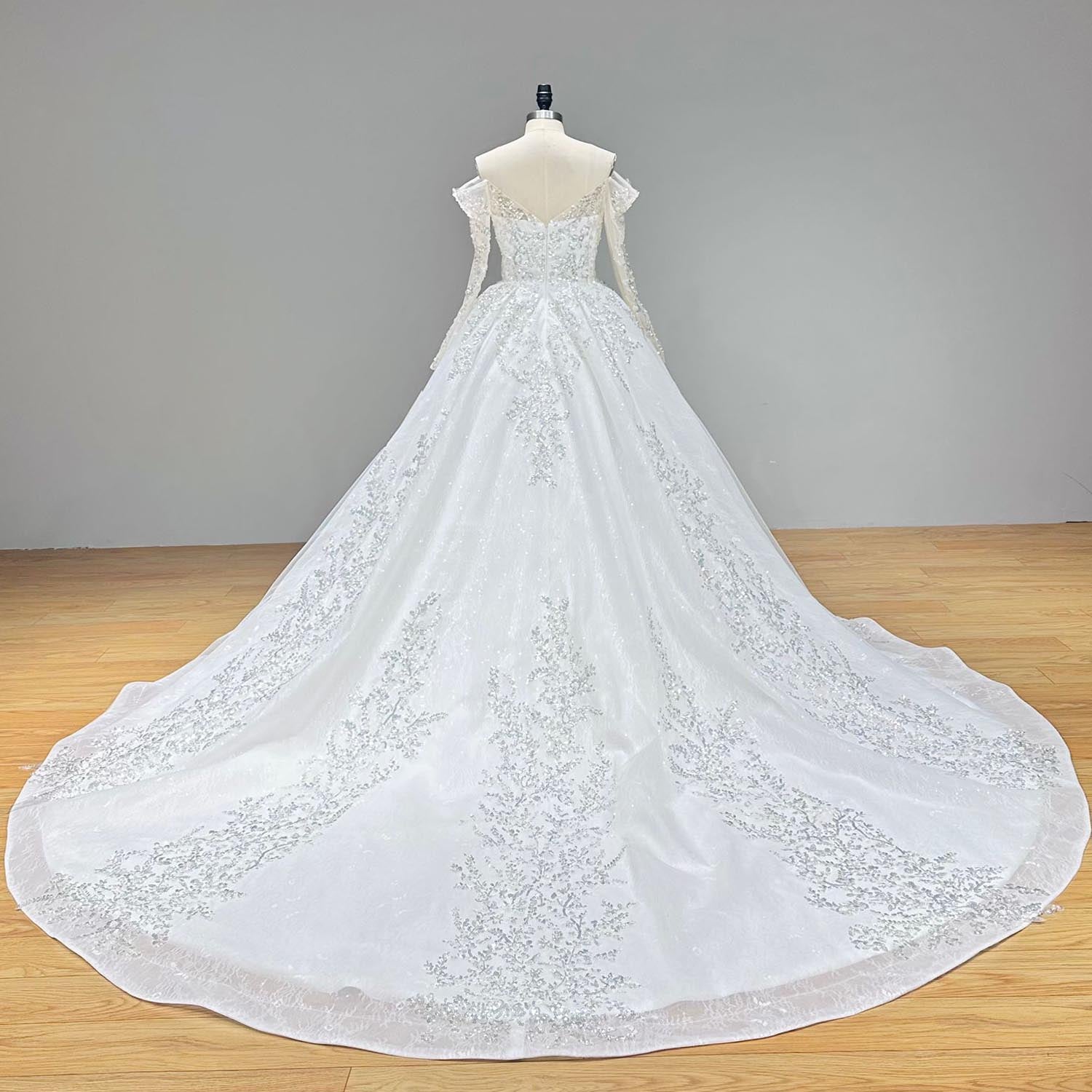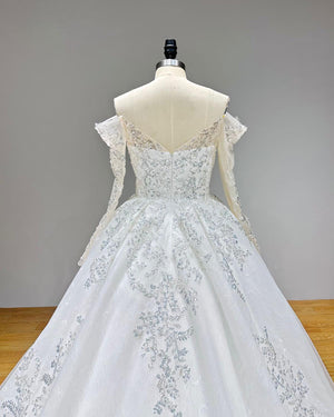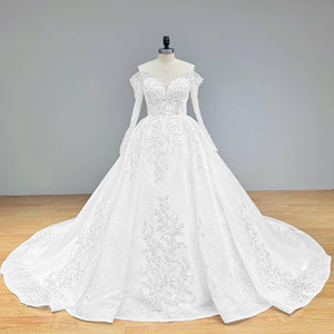 Off Shoulder Ball Gown Wedding Dress with Beading Pearls Long Sleeve
