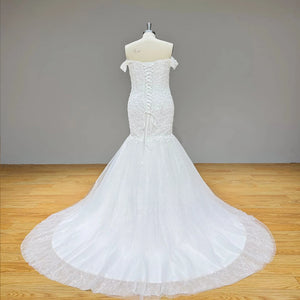Make a breathtaking entrance in this off-shoulder tulle mermaid wedding dress, where timeless elegance meets modern charm. Adorned with intricate beading and flowing tulle, this gown ensures a romantic, unforgettable look from every angle.