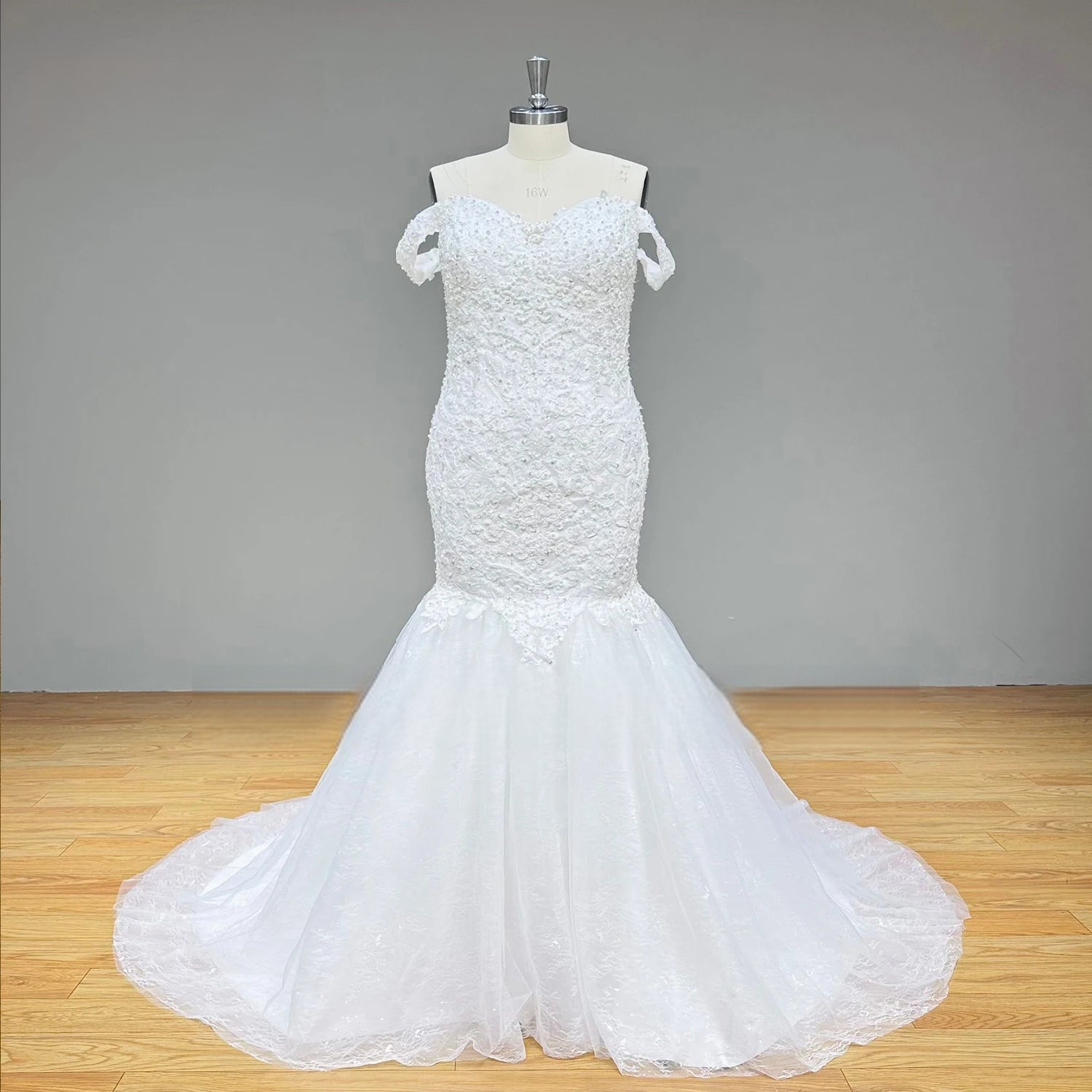 Off-Shoulder Tulle Mermaid Wedding Dress with Beading and Pearls