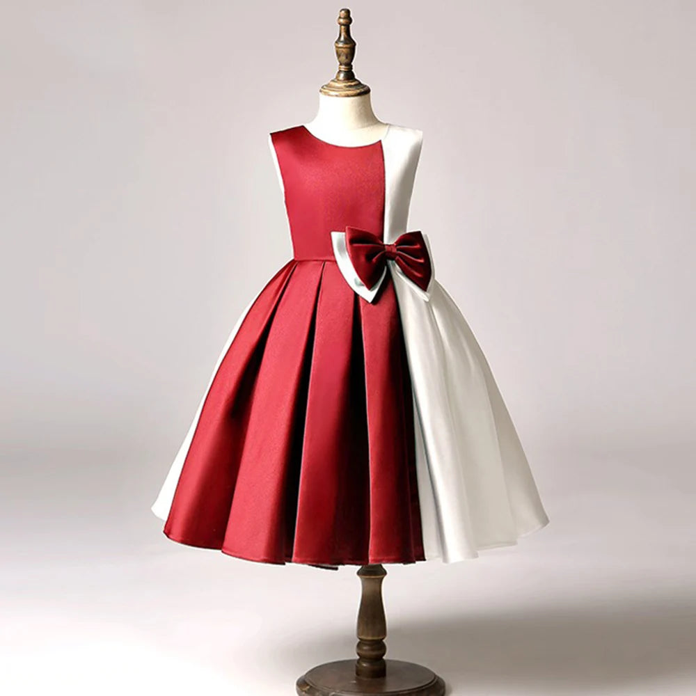Satin Flower Girl Dress with Bow Junior Bridesmaid Formal Wedding Party Gown