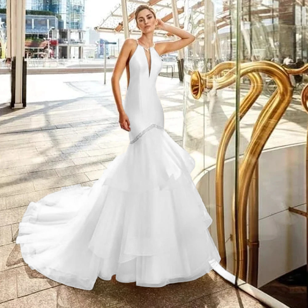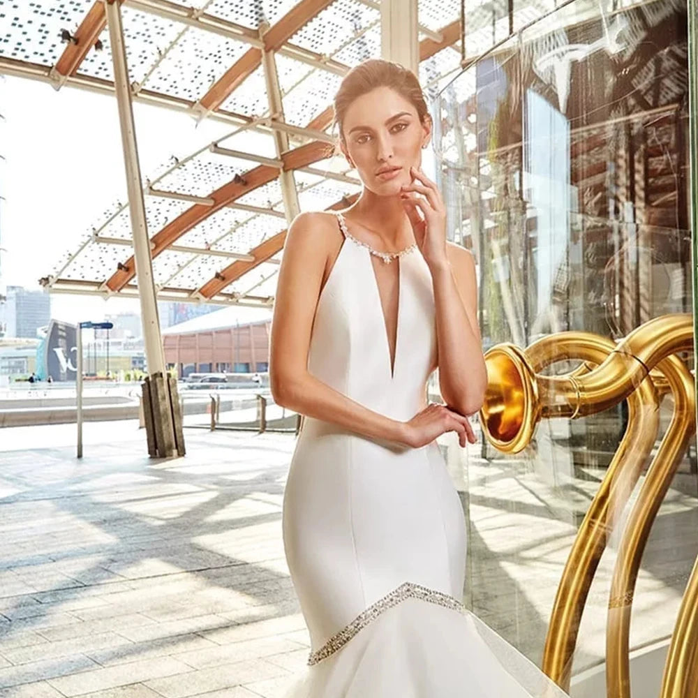 Satin Mermaid Wedding Dress Simple Vestido de Noiva Sereia Backless Sexy Bridal Gown