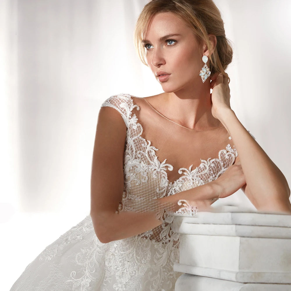 Sexy A-Line Illusion Cap Sleeve Lace Princess Wedding Dress Luxury Court Train Vintage Bridal Gowns