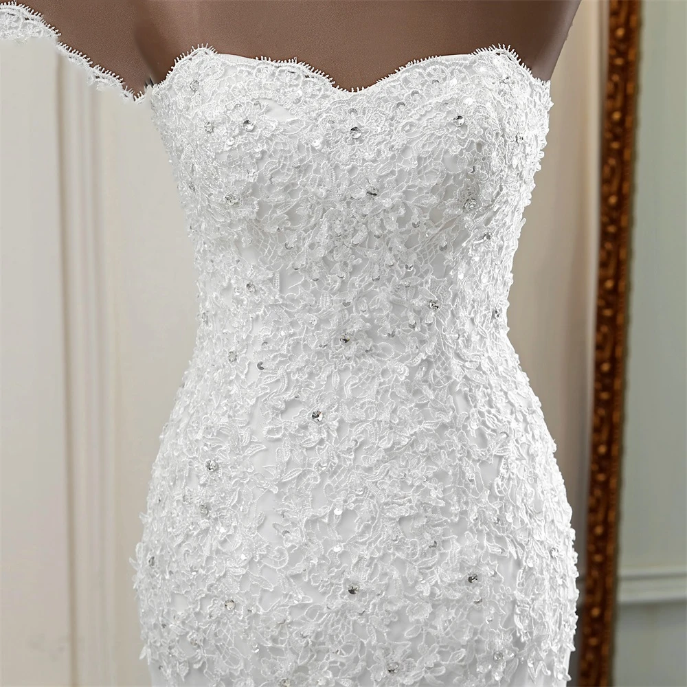 Embrace elegance in our Sexy Strapless Mermaid Wedding Dress, featuring a sleek silhouette and intricate detailing. Designed for the modern bride, this gown offers timeless glamour and a flattering fit for any season.