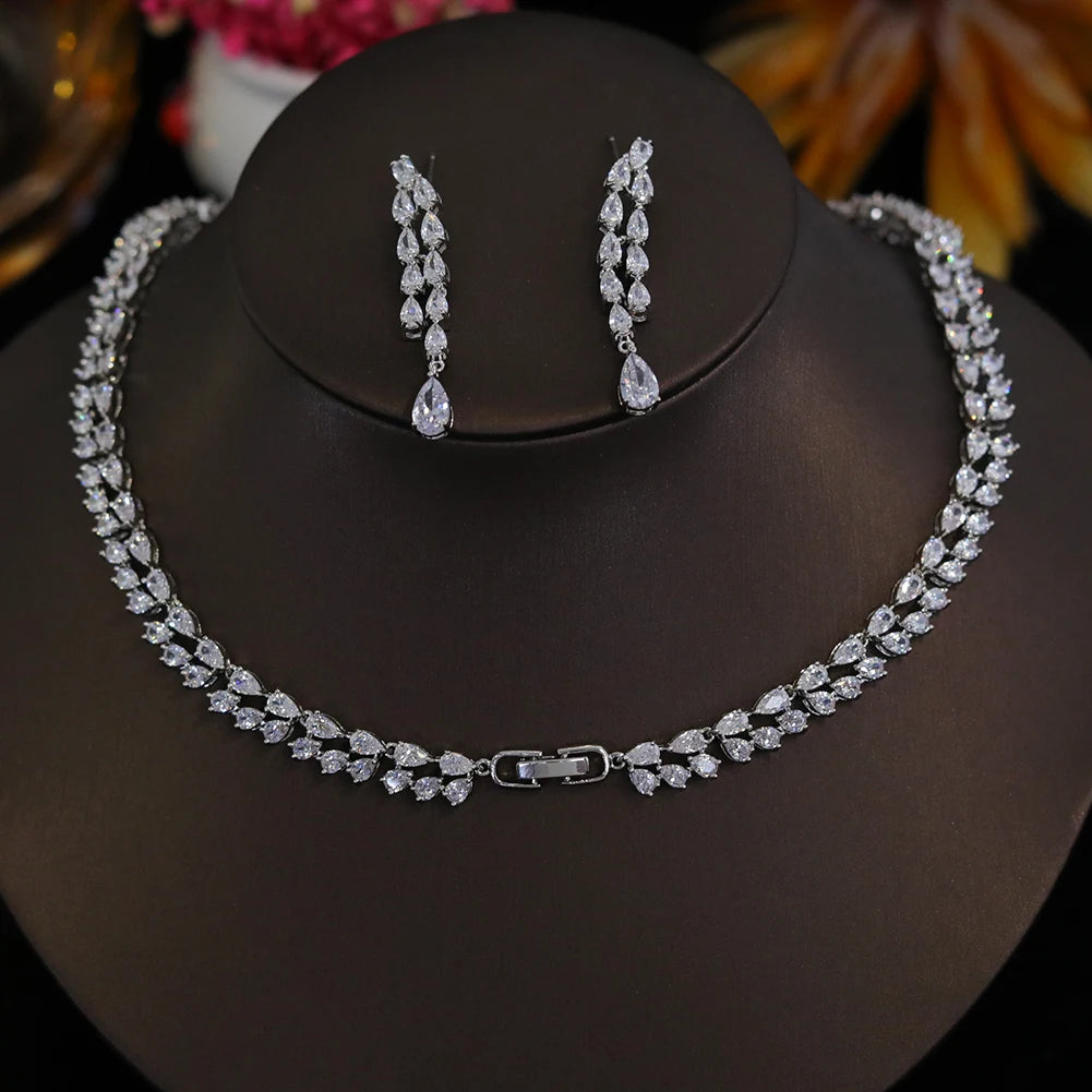 This exquisite 2-piece Shiny AAA Cubic Zirconia Bridal Necklace Set is the perfect accessory for your wedding day. Crafted with high-quality AAA cubic zirconia stones, it sparkles with brilliance, adding an elegant touch to any bridal ensemble. The set includes a stunning necklace and matching earrings, designed to elevate your look for the wedding or any special occasion. The dazzling shine of the cubic zirconia stones mimics the beauty of real diamonds, offering a luxurious feel at an affordable price. The classic design ensures that it pairs beautifully with a variety of wedding dresses, from traditional to modern styles. Whether you're walking down the aisle or attending a wedding party, this necklace set will make you feel like a true queen. It’s an ideal choice for brides who want a statement piece that will stand the test of time. Lightweight and comfortable to wear, it ensures you’ll shine all day and night. This set is not just jewelry; it’s a memory that will last a lifetime. Make your special day even more unforgettable with this stunning bridal necklace set.
