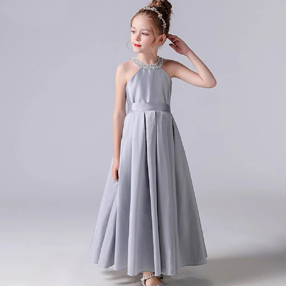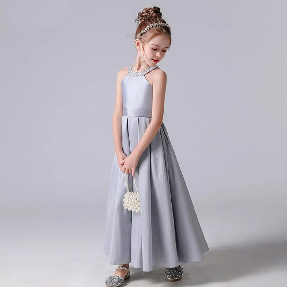 Silver Satin Halter Flower Girl Dress Long Princess Pageant Gown
