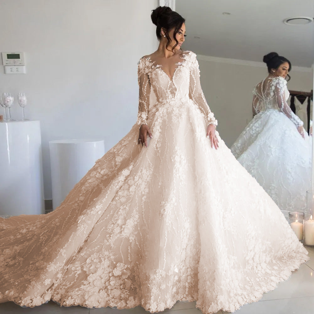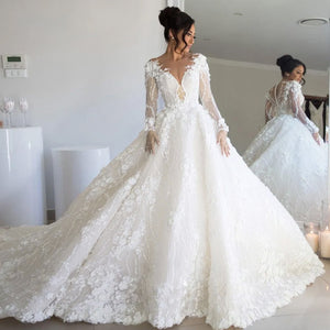 Vintage Bridal Gown Long Sleeve Lace Ball Gown Wedding Dresses Luxury Flower Chapel Train